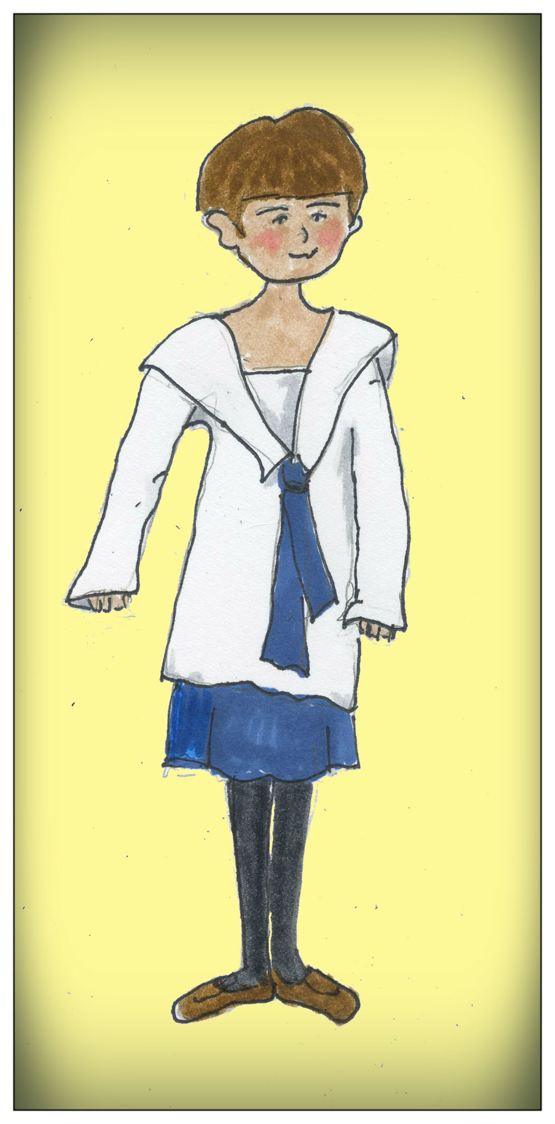 So my mother made some creative changes.  She had me put the jumper on first, and over it, my sister’s blouse with the sailor collar.  Too big for me, the blouse hung long over my jumper.  That’s a middy blouse, my mother explained.  Then she gave me black tights (my sister’s – I wasn’t allowed to wear black) and my Sunday shoes.  Now you look like a proper Orphan, said my mother.